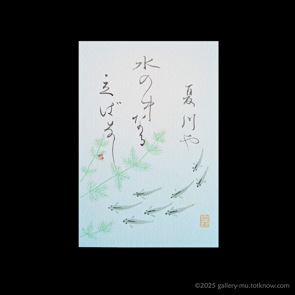 This haiku is paired with a charming image—almost as if tiny medaka fish were gathered, chatting together.