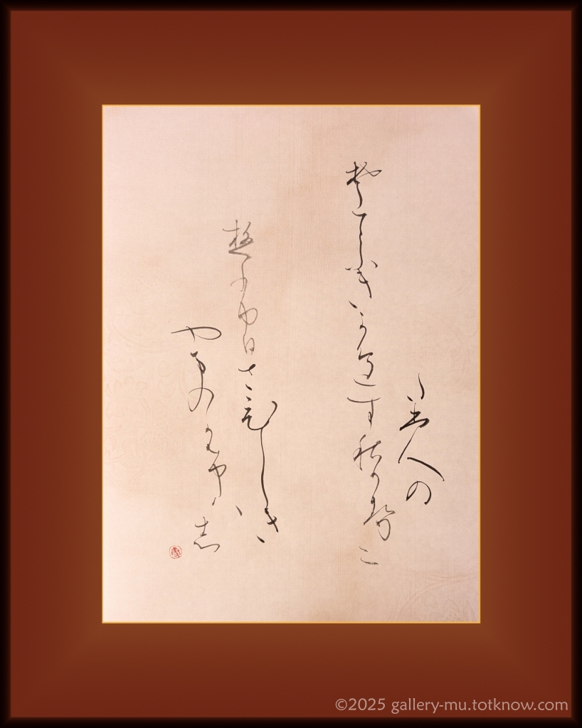 To gently counterbalance the poem’s stark, desolate mood, I wrote the calligraphy on warm-toned ryōshi (traditional handmade paper), envisioning an elegant and dignified framing. The softness of the paper’s color brings a subtle warmth to the melancholy scene the poem evokes.